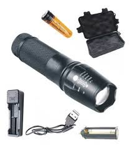 Linterna táctica de alto poder. Diseño potente, resistente, duradero y totalmente resistente al agua. Esta diseñada para las duras condiciones del aire libre. Fabricada con aluminio de grado aeronáutico. Acabado anodizado duro. Led Cree XP-E Zoom y clip. Cinco modos de iluminación: Alta (Intensidad 600 lúmenes) – Media – Baja – SOS – Strobo. Distancia máxima: 250 metros. Autonomía máxima: 310 horas. Funciona con una batería recargable 14500 o 1 pila AA. Resistencia al agua 1.5 metros. Resistencia a caídas desde 2 metros. Dimensiones: 90mm de largo x 25,4mm Ø. Incuye: Caja plástica, batería 14500 y cargador con cable a conexión USB.