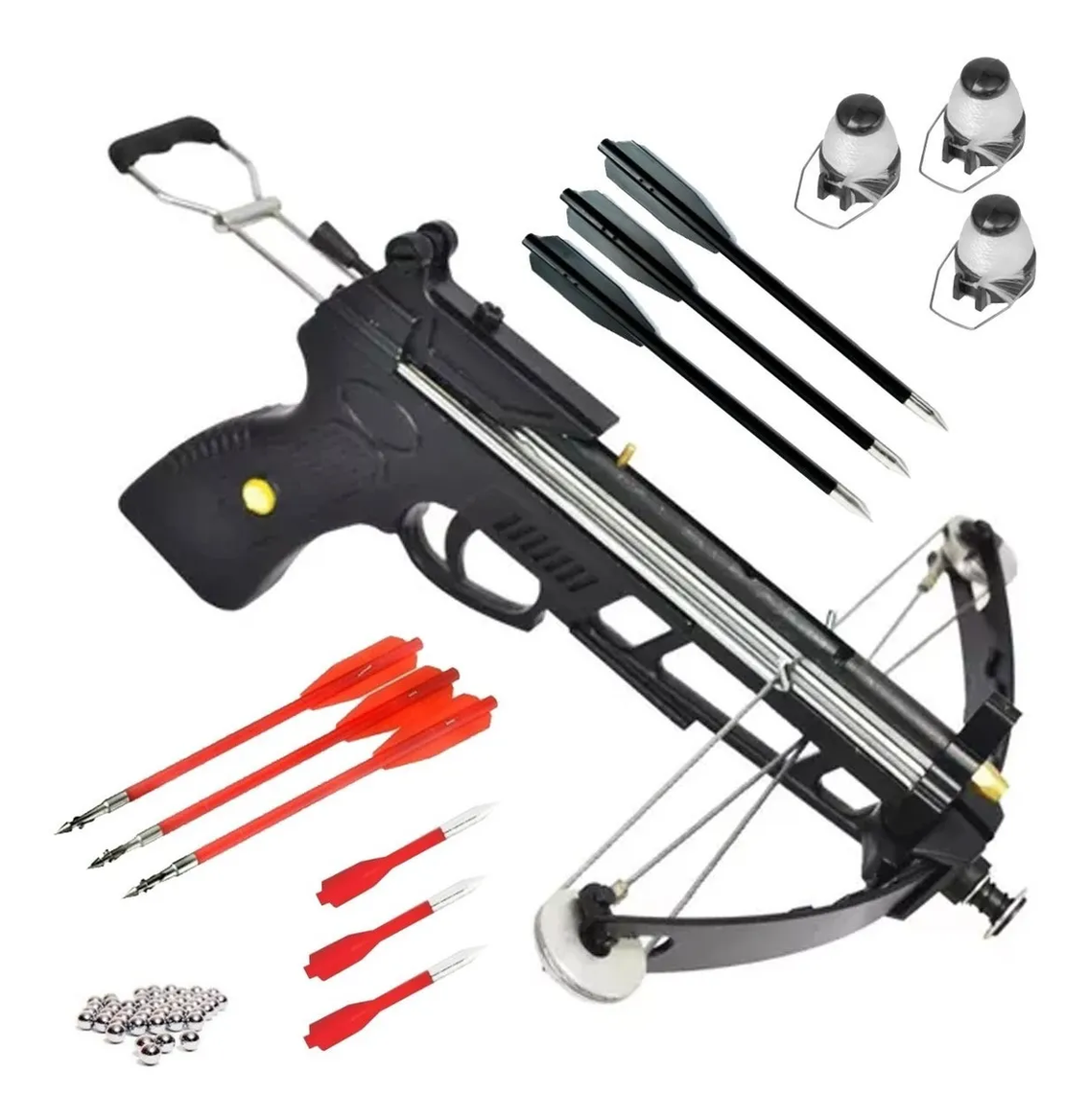 2A - BALLESTA VELOCIDAD 120 FPS - POTENCIA 50 Lbs MEDIDAS 27*29cm - PESO 1.5KG RANGO EFECTIVO 56M POTENCIA 50 Lbs CARGADOR PARA BALINES Capacidad: 15 bolas de acero INCLUYE: 3 FLECHAS 175MM DE PESCA 3 FLECHAS 160MM DE CAZA 2 FLECHAS 80MM DE CAZA 3 FLECHAS 25MM RUEDA 20 BALINES ESFERICOS DE 6MM