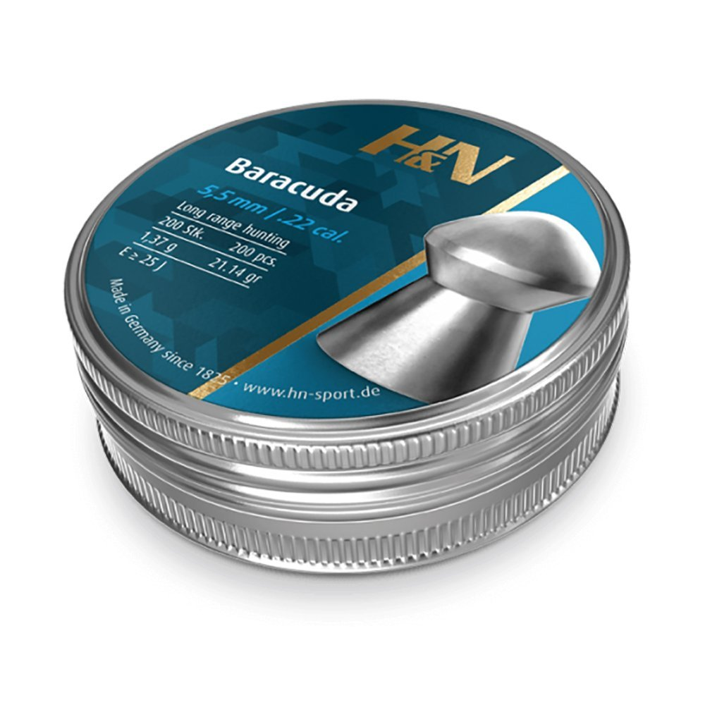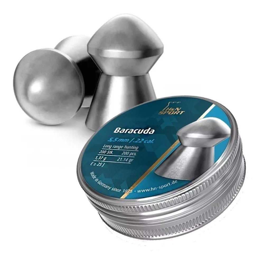 BALINES H&N BARRACUDA 5.5mm X 200 UNIDADES Balín pesado, muy preciso para distancias largas. Diseño aerodinámico extraordinario para un alto poder de perforación y profundidad. Grupos de disparo pequeños. Emplomado muy bajo y agrupaciones homogéneas gracias a la aleación especial y engrase. Liso.