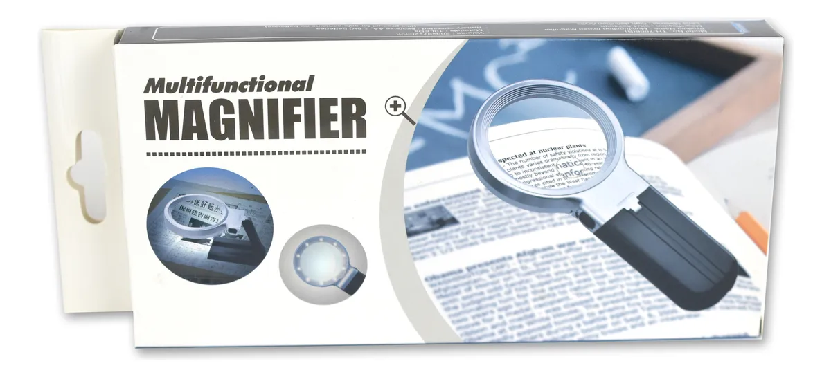 LUPA ATH-7006B Lupa de mano multifunción Material del lente: Acrílico de alta definición. Aumento: 3X. Peso: 105 gramos. Con Leds. Cantidad de leds: 10LEDs. Baterías: 2 pilas AA, 1.5V. (No incluidas)