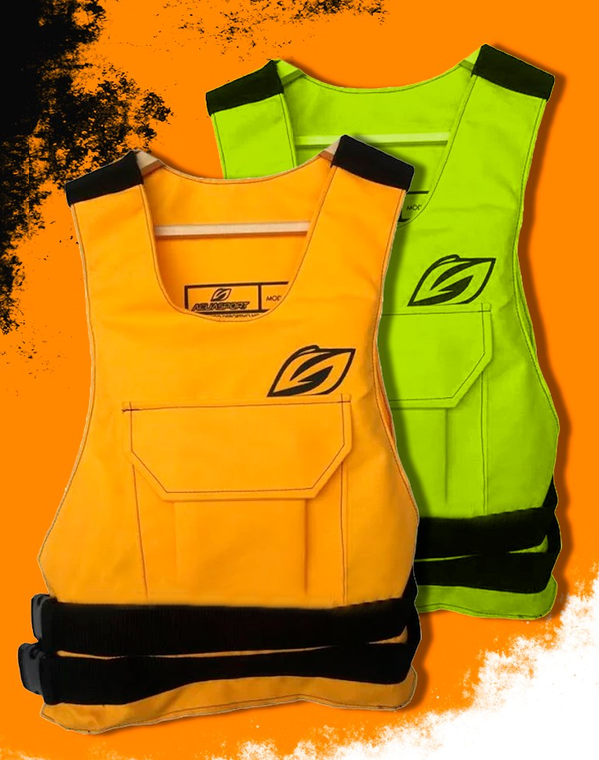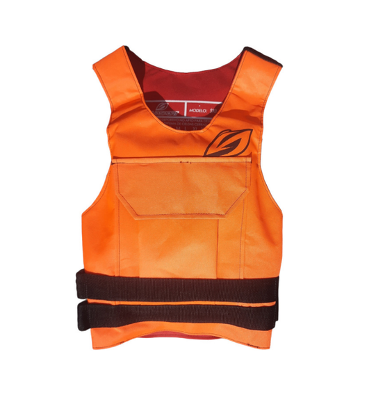 Disponible del talle M al XXXL. Confeccionado en tela cordura y relleno de espuma de polietileno de celda cerradas. Se coloca tipo poncho y es abierto en los laterales para evitar el roce durante el remado. Posee un bolsi lo en el frente y cierre en un lateral con dos hebilas de recina acetal de 40mm. Es corto y no molesta al sentarse