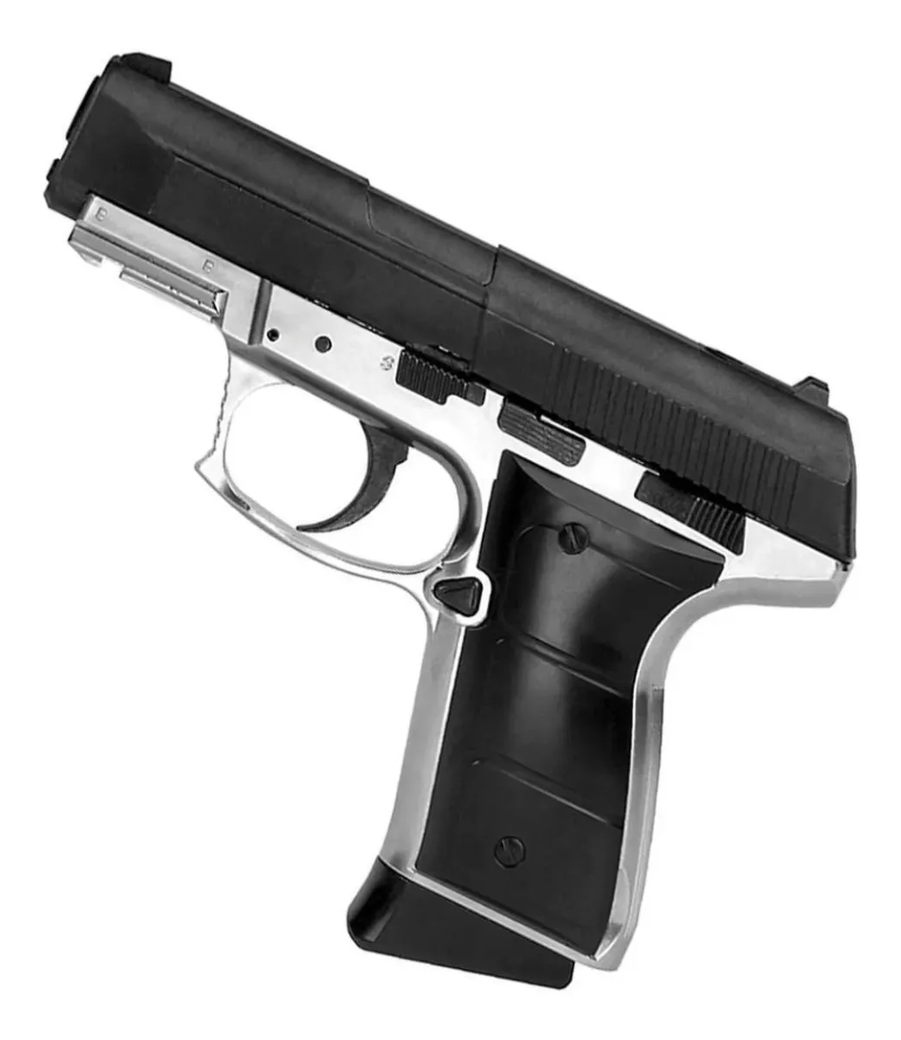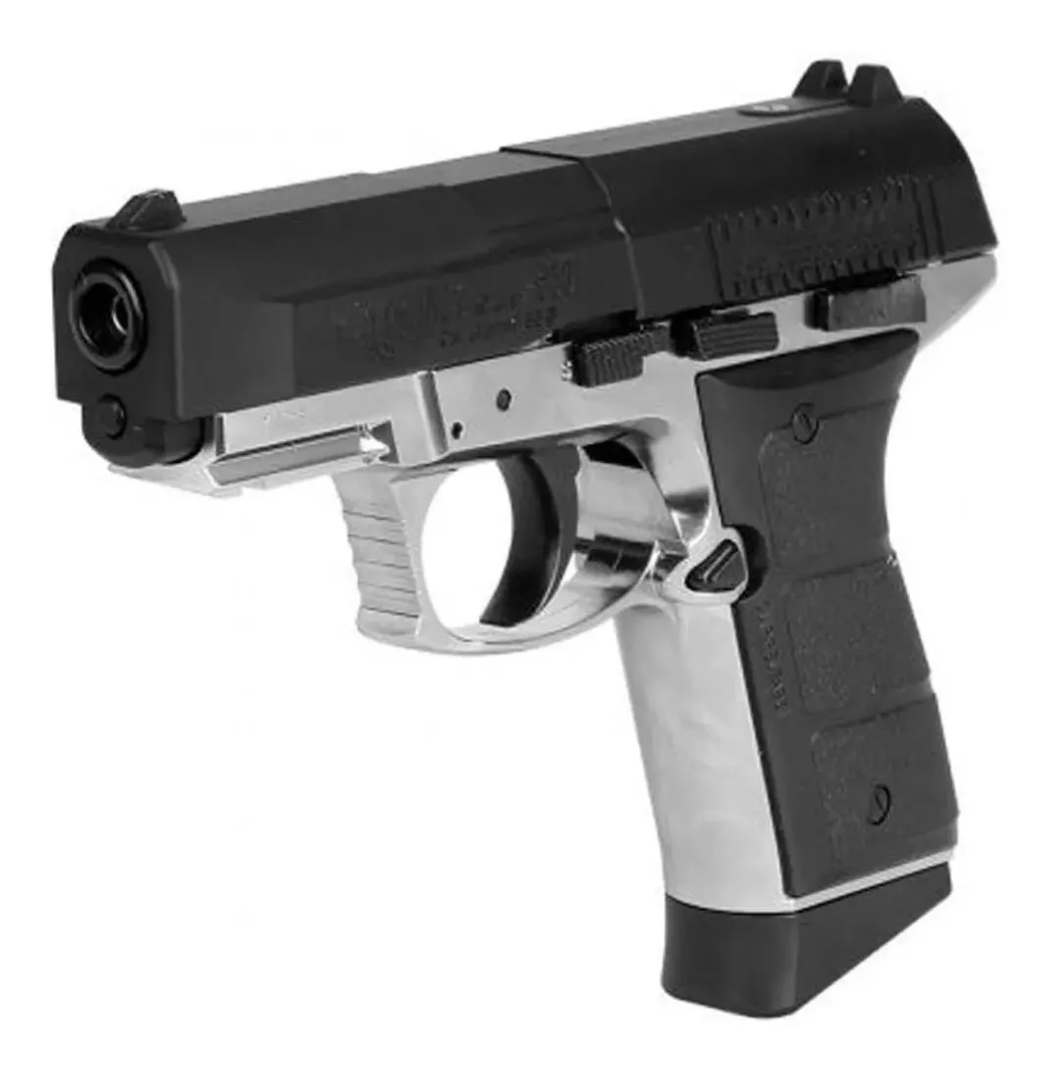 Fuente de poder: CO2 Acción: Semiautomática blowback Seguro: Manual Material del armazón: Metal Velocidad de salida: 430 fps Longitud total: 6.8” / 17 cm Calibre: 4,5 mm (.177.) solo BB Cañón: de acero de ánima lisa Capacidad del cargador: 15 disparos Peso: 735 gr