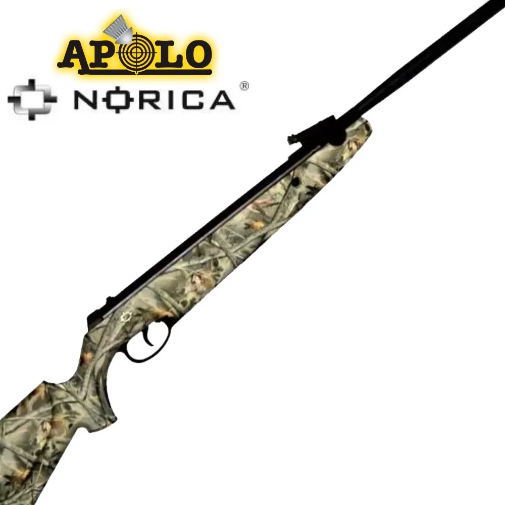 Apolo/Norica AP-N500 Nitro pistón 2. Rifle con sistema nitro pistón con mas carga que le otorga mayor potencia. Velocidad de 335 m/seg con balines de aluminio y 280 m/seg con ballines de plomo. Cal. 5.5mm. Caño martillado en frío de 12 microestrias forrado en polímero. Culata sintética camuflada. Seguro de disparo automático. Alza y guión con fibra óptica. Origen España