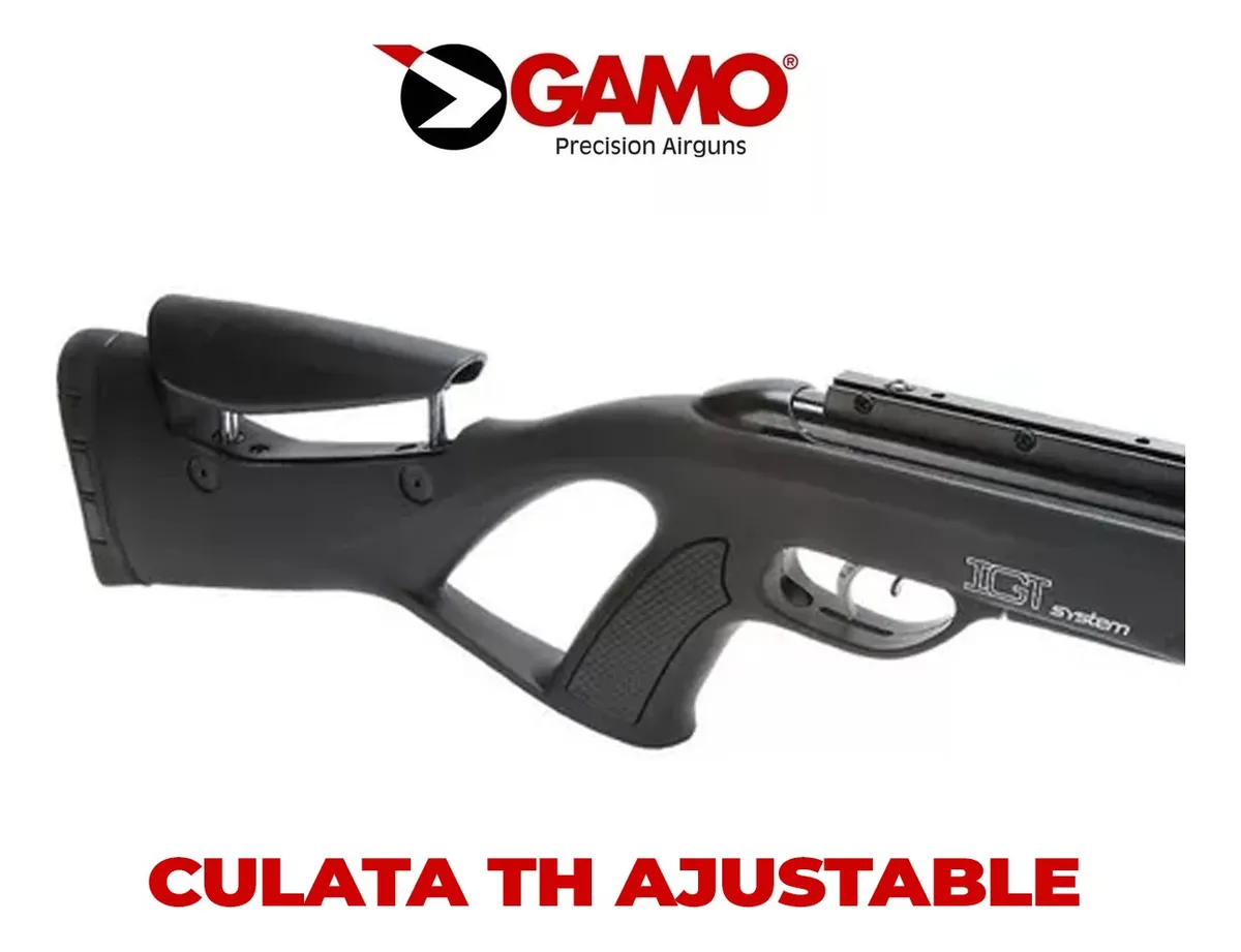 o Marca: Gamo o Modelo: Elite Whisper IGT o Calibre: 5.5 mm (.22) o Fuente de Potencia: Nitro Pistón o Sistema de disparo: Monotiro o Potencia: 750 FPS o Peso: 2,900 kg. o Largo total: 117 cm. o Tipo de caño: Whisper o Tipo de culata: Táctica - Thumbhole o Material de la culata: Polímero de alto impacto o Origen: España o Mira abierta de fibra óptica o Riel para colocación de mira telescópica o Seguro de gatillo manual o Gatillo SAT de 2 etapas regulable o Cantonera de goma regulable o Carrillera regulable