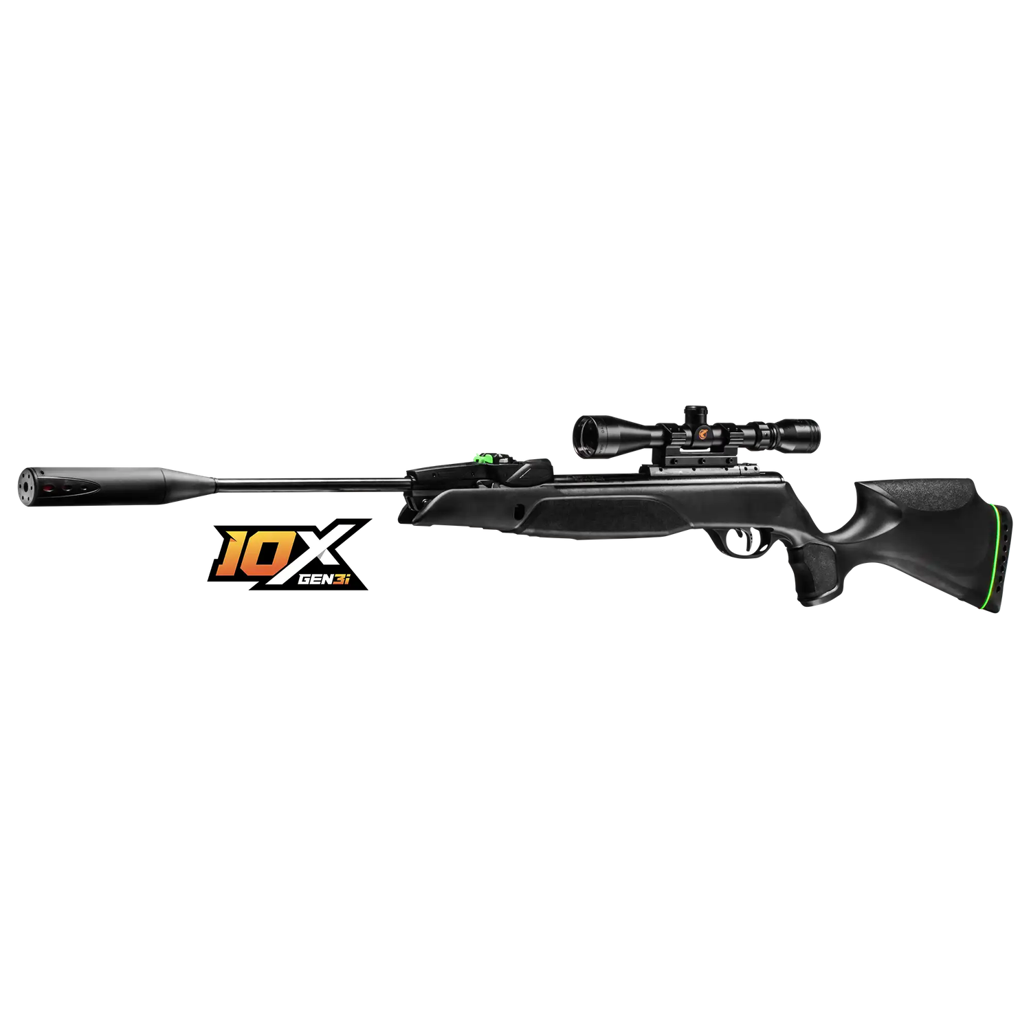Dimensiones: 51 × 2.688 × 7.25 pulgadas Calibre: .22 Velocidad: .22 – 1,300 pies por segundo (fps) con balines de aleación (Alloy Pellets) Acción: Tecnología de autocarga de diez disparos 10X GEN3i Amortiguación de ruido (Noise dampening): Whisper Fusion Sistema de potencia (Powerplant): Pistón de gas IGT Mach 1 (Tecnología de Gas Inerte, cilindro de 33 mm) Cañón (Barrel): Cañón de acero estriado con camisa metálica Gatillo (Trigger): CAT (Custom Action Trigger) ajustable de forma independiente de dos etapas Culata (Stock): Polímero de nylon relleno de vidrio de calidad automotriz (para todo tipo de clima) Picado (Checkering): Diseño de textura antideslizante en la empuñadura y el guardamanos Cantonera (Recoil Pad): Cantonera SWA (Shock Wave Absorber) con hasta un 74% de absorción de retroceso Seguro (Safety): Seguro manual y sistema de seguridad de amartillado automático* Óptica (Optics): Incluye una mira telescópica GAMO 3-9×40 con anillas (a prueba de golpes, a prueba de niebla) Riel (Rail): Riel de aluminio de 11 mm, RRR (Recoil Reducing Rail - Riel Reductor de Retroceso) Peso (Weight): 6.88 libras Longitud (Length): 49.2 pulgadas Longitud de culata (Length of Pull): 15 pulgadas Munición (Ammunition): Calibre .22 – Cualquier balín de calibre .22 Presión del gatillo (Trigger Pull): 3.2/2.6 libras Longitud del cañón (Barrel Length): 21.3 pulgadas Esfuerzo de amartillado (Cocking Effort): 41 libras Energía (Energy): 33.19 ft/lbs – 45 J Seguro Manual: El seguro manual es la palanca que se encuentra delante del gatillo; si la empuja hacia adelante, el seguro está desactivado, si la jala hacia atrás (hacia el gatillo), el seguro está activado. Asegúrese de no desactivar el seguro hasta que esté listo para disparar.