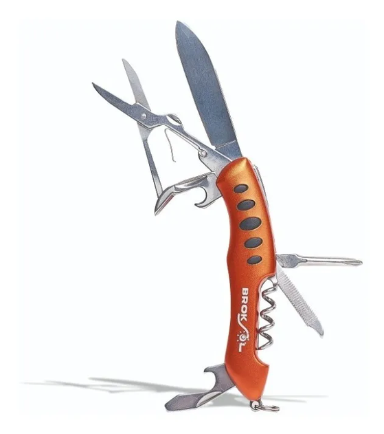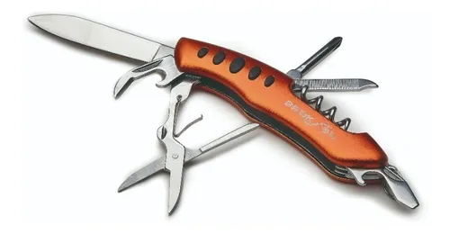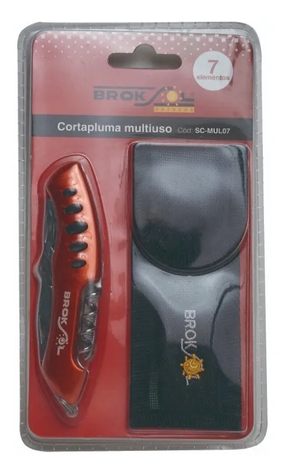 DESCRIPCIÓN Cortapluma multiuso 8 elementos: Philips, destapador, cortapluma, destornillador plano, lima, saca corcho, abrelatas y tijera. Medida cerrada: 9,8 cm. Incluye funda de cordura y aro para llavero.