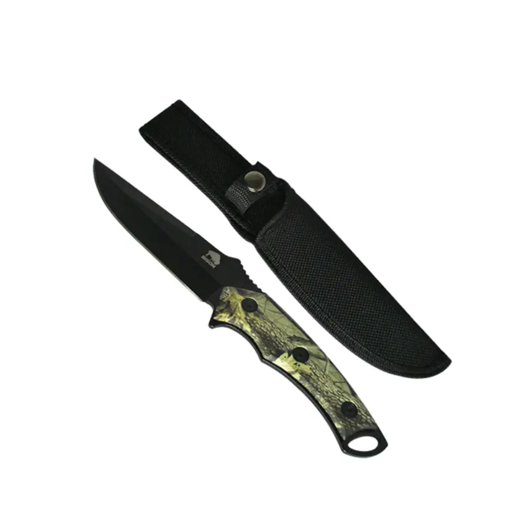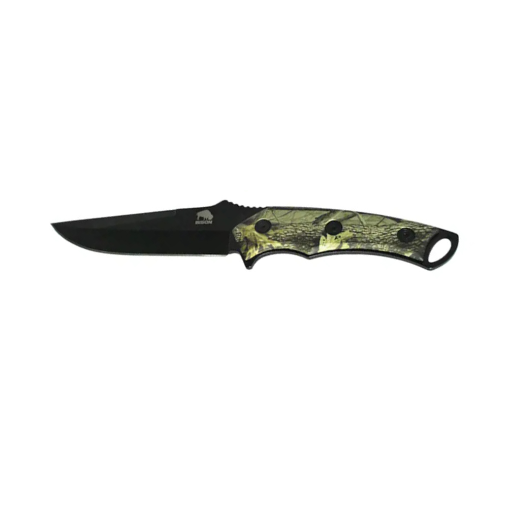 Marca: Bison. Cuchillo de caza. Hoja acero inoxidable 420. Color: negro. Largo total: 25 cm. Largo de la hoja: 14 cm. Mango: polimero camuflado.