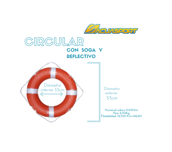 Circular fabricado en polietileno de alta densidad, resistente a rayos UV8. Viene con agarres de cabo de 8mm y bandas confeccionadas en rib stop ó cordura color blanco ó azul con reflectivo color gris. Numeral cúbico 0.0455m Peso 2,150kg Flotabilidad: 14,550 KG=142.6N