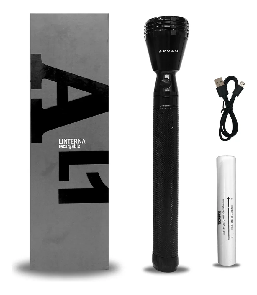 Potencia: 600 lumens Color: Negro Tipo de luz: LED CREE Batería: 12hs Cargador USB Largo linterna: 29 cm Ancho cabezal: 5 cm Ancho mango: 3 cm Incluye batería y cable de carga USB
